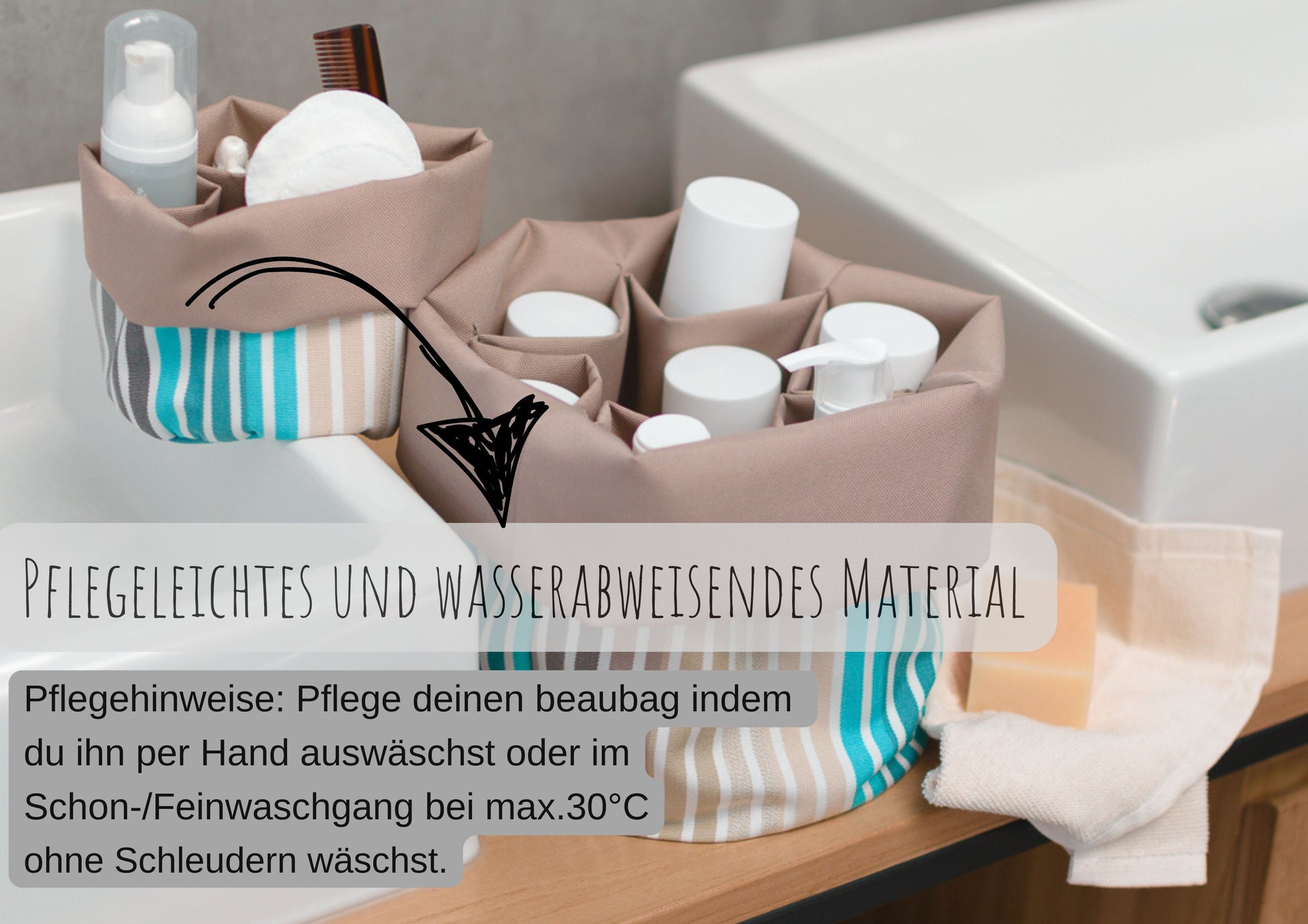 Pflege deinen beaubag indem du ihn per Hand auswäschst oder im Schon-/Feinwaschgang bei max.30°C ohne Schleudern mit wäschst |